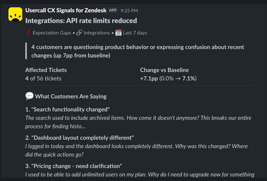 UserCall CX Signals analyzes your Zendesk tickets daily, detects emerging customer pain points, and alerts your team in Slack—so you know exactly what needs fixing or deeper user research.